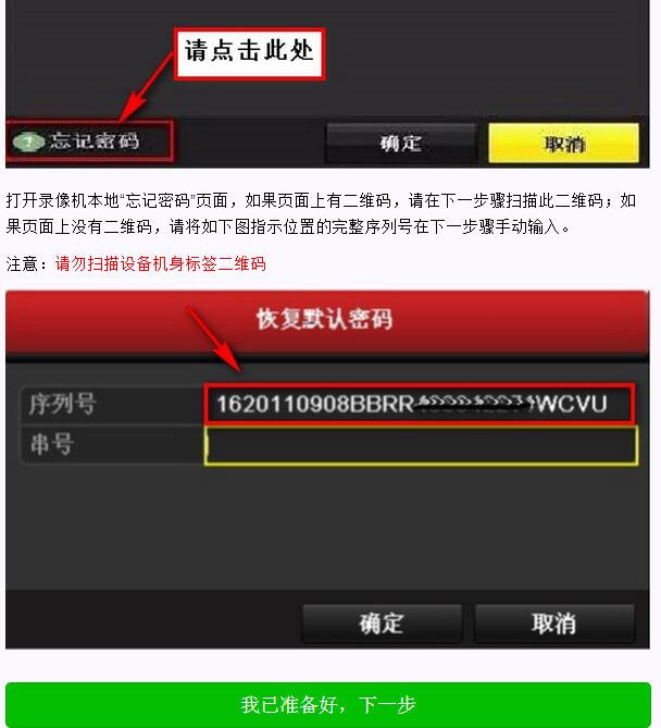 第三步:根據(jù)提示,在錄像機(jī)的輸入密碼界面選擇“忘記密碼”,查看序列號(hào)或者二維碼。