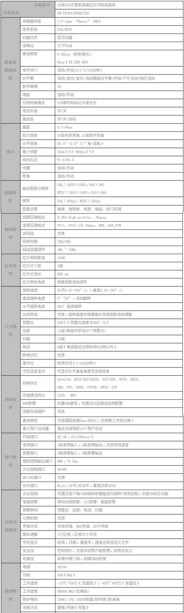 ●20倍200萬像素高清紅外網(wǎng)絡(luò)高速球型攝像機(jī)參數(shù):